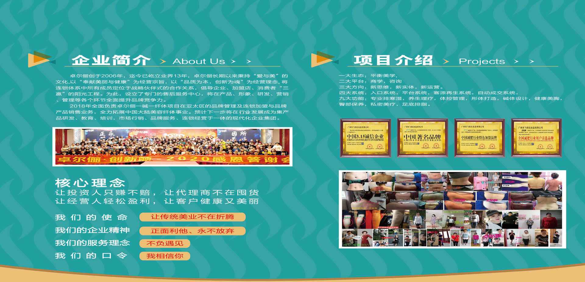 卓爾儷創(chuàng)于2006年,迄今己屹立業(yè)界13年,卓爾儷長(zhǎng)期以來(lái)秉持“愛(ài)與美”的文化,以“奉獻(xiàn)美麗與健康”為經(jīng)營(yíng)宗旨,以“品質(zhì)為本,創(chuàng)新為魂”為經(jīng)營(yíng)理念,將連鎖體系中所有成員定位于戰(zhàn)略伙伴式的合作關(guān)系,倡導(dǎo)企業(yè)、加盟店、消費(fèi)者“三贏(yíng)”的陽(yáng)光工程。為此,設(shè)立了專(zhuān)門(mén)的售后服務(wù)中心,將在產(chǎn)品、形象、研發(fā)、營(yíng)銷(xiāo)、管理等各個(gè)環(huán)節(jié)全面提升品牌競(jìng)爭(zhēng)力。      2018年全面負(fù)責(zé)卓爾儷一堿一纖體…